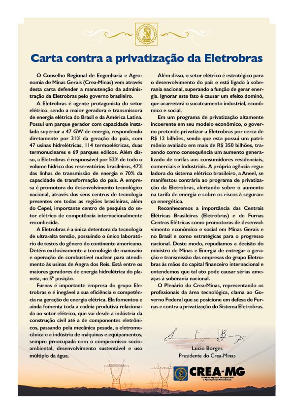 Além disso, o Crea-Minas reconhece a “importância das Centrais Elétricas Brasileiras (Eletrobras) e de Furnas Centrais Elétricas como promotoras de desenvolvimento econômico e social em Minas Gerais e no Brasil e como estratégicas para o progresso nacional”.