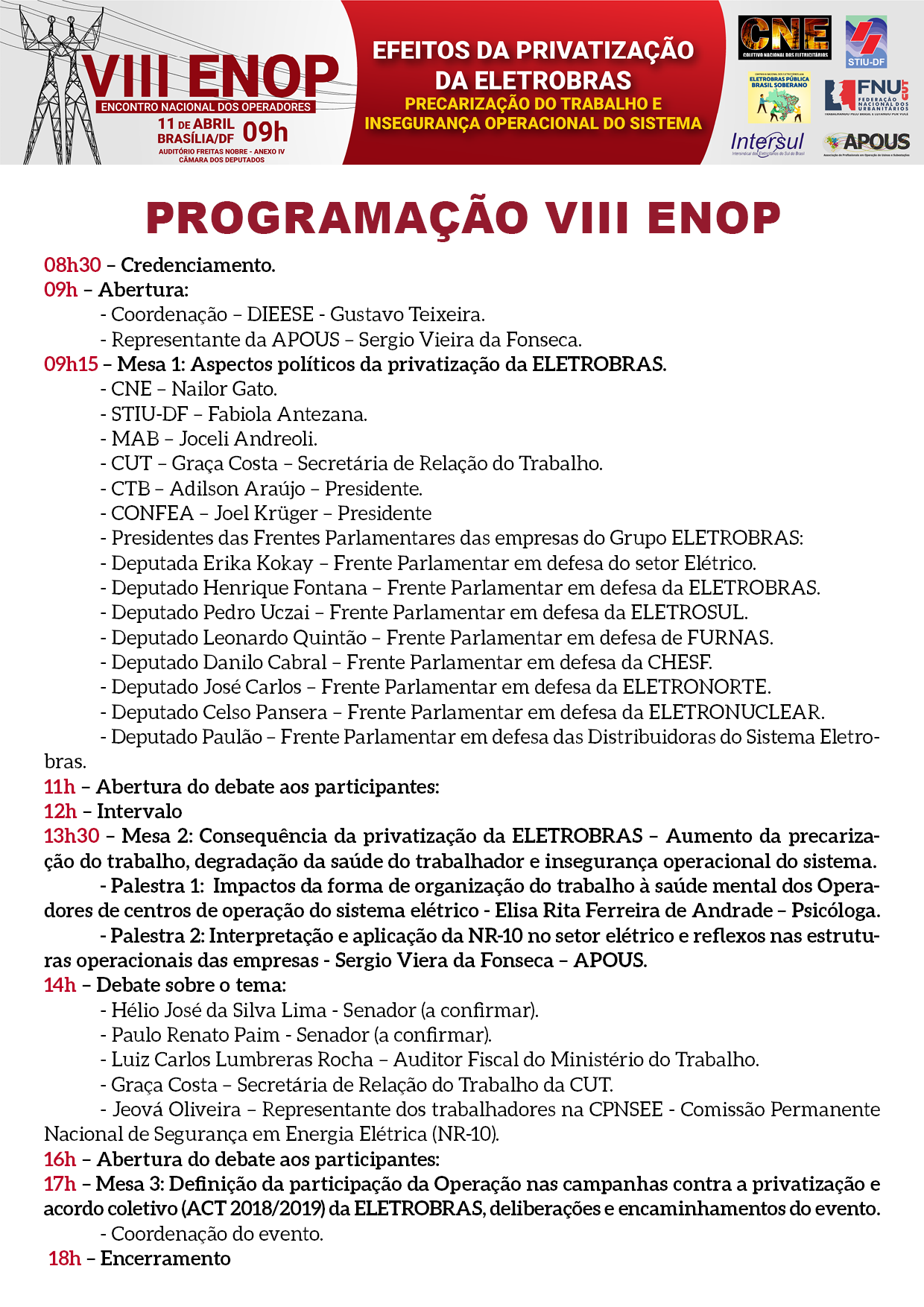 Operadores do Sistema Elétrico Brasileiro se reunirão no dia 11 de abril, em Brasília, para debater os efeitos da privatização da Eletrobras, a precarização do trabalho e a insegurança operacional do sistema durante o VIII Encontro Nacional da categoria.