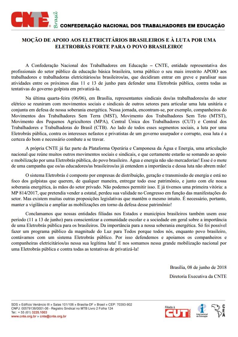 A Confederação Nacional dos Trabalhadores em Educação – CNTE, entidade representativa dos profissionais do setor público da educação básica brasileira, emitiu nesta sexta-feira (8) uma moção de apoio aos eletricitários e à luta por uma Eletrobras forte para o povo brasileiro.