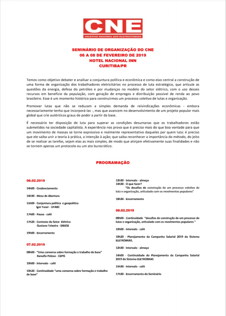 Em continuidade à luta em defesa do setor elétrico estatal, o Coletivo Nacional se reúne entre os dias 6 e 8 de fevereiro, em Curitiba, para debater e analisar a conjuntura política e econômica, tendo como eixo central o planejamento estratégico no processo de enfrentamento à entrega do patrimônio público. A entidade destaca o país se encontra em um “momento histórico para construirmos um processo coletivo de lutas e organização” da classe trabalhadora.