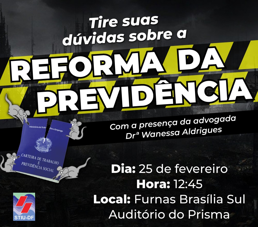 Na segunda-feira (25), o STIU-DF vai realizar o primeiro debate sobre o projeto da reforma da Previdência apresentado pelo governo Bolsonaro. A atividade acontece em Furnas, na subestação de Brasília Sul e vai contar com a participação da advogada Wanessa Aldrigues, especialista em direito previdenciário.
