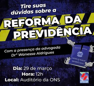 O STIU-DF vai realizar mais um debate sobre o projeto da Reforma da Previdência apresentado pelo governo Bolsonaro. A atividade acontecerá no dia 29/03/2019 de 12h00 as 14h00 no auditório do Operador Nacional do Sistema Elétrico (ONS) e vai contar com a participação da advogada Wanessa Aldrigues, especialista em direito previdenciário. O trabalhador também poderá, nessa oportunidade, acompanhar o andamento de seus processos junto ao INSS.