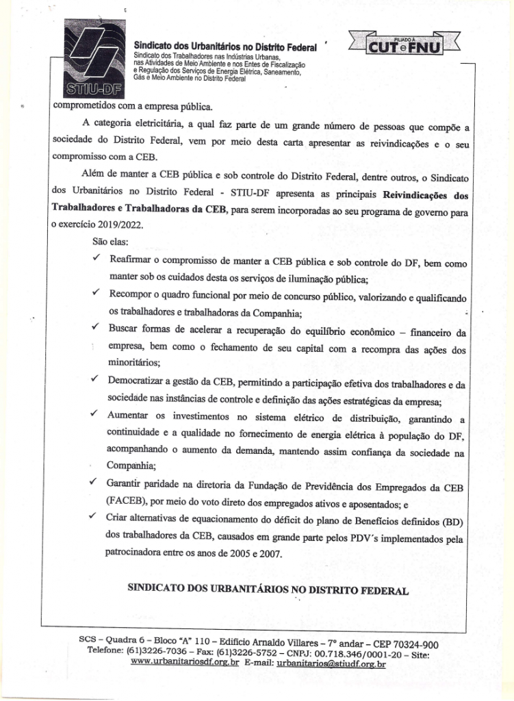 Durante a campanha eleitoral, o então candidato ao governo do DF, Ibaneis Rocha (MDB), recebeu dirigentes sindicais do STIU-DF para tratar da situação da CEB, na oportunidade foi entregue carta aberta com uma série de reivindicações da categoria que deveriam ser incorporadas ao programa de governo, dentre elas o compromisso de manter a CEB pública e sob controle do DF. Na ocasião, Rocha reconheceu a importância da estatal para a cidade e firmou acordo de preservar a empresa pública.