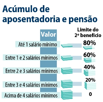 A proposta limita o acúmulo da pensão por morte com a aposentadoria. Pela proposta de Bolsonaro, o segurado teria que escolher o benefício de maior valor, mantido em 100%, ficando limitado a receber um percentual adicional do segundo, que terá descontos graduais em função do valor, até quatro salários mínimos. Quanto maior a soma dos benefícios, maior será esse limite.