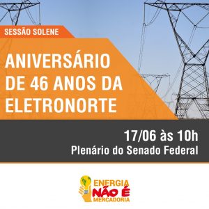 O Senado vai realizar no dia 17, segunda-feira, sessão especial para homenagear o aniversário de 46 anos da Eletronorte. Criada em 20 de junho de 1973, com sede no Distrito Federal, a estatal gera e fornece energia elétrica para os estados do Acre, Amapá, Amazonas, Maranhão, Mato Grosso, Pará, Rondônia, Roraima e Tocantins.
