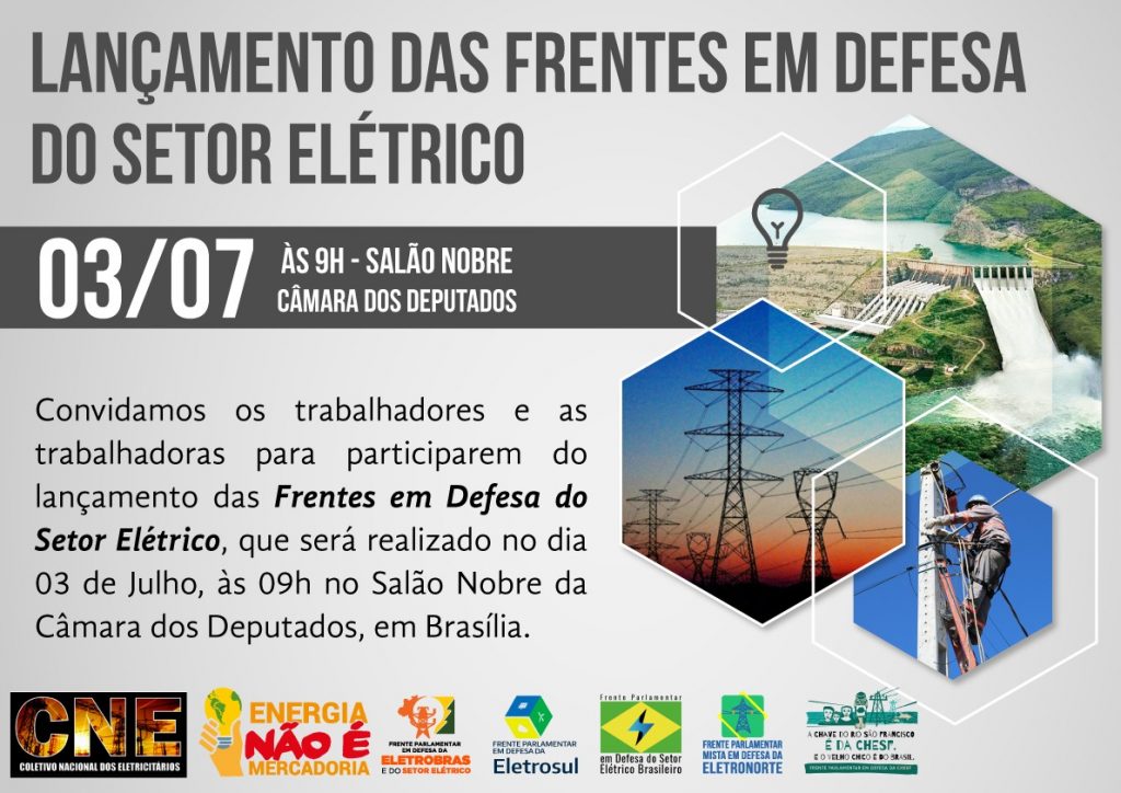 Na próxima quarta-feira (3) acontece, na Câmara dos Deputados, o lançamento das Frentes em Defesa do setor elétrico estatal, que tem como objetivo atuar na luta contra a privatização da Eletrobras e suas controladas, garantindo à população segurança energética, modicidade tarifária e qualidade na prestação do serviço. O evento acontece no Salão Nobre da Casa, às 9h.