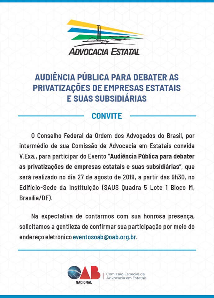 A OAB Nacional, por meio da Comissão de Advocacia em Estatais, promoverá no dia 27 de agosto a “Audiência Pública para debater as privatizações de empresas estatais e suas subsidiárias”. Segundo o presidente da comissão, Carlos Alberto Regueira de Castro e Silva, o foco do debate será a atual política promovida pelo governo federal. A audiência será realizada na sede do Conselho Federal, em Brasília.