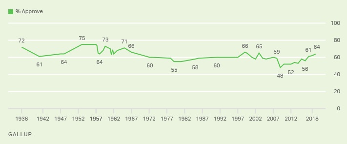 O levantamento foi feito pelo reconhecido instituto de pesquisas norte-americano Gallup. A série histórica começa em 1936, sendo que, até meados da década de 1970, a aprovação dos sindicatos era constante em cerca de 70% da população. Após esse período, houve um declínio que culminou com o registro mais baixo da série, em 2008, após a grande crise, com 48%. Os anos de 1999 e 2003 foram os únicos com maior acolhimento sindical entre a população do que hoje: 66% e 65% respectivamente.