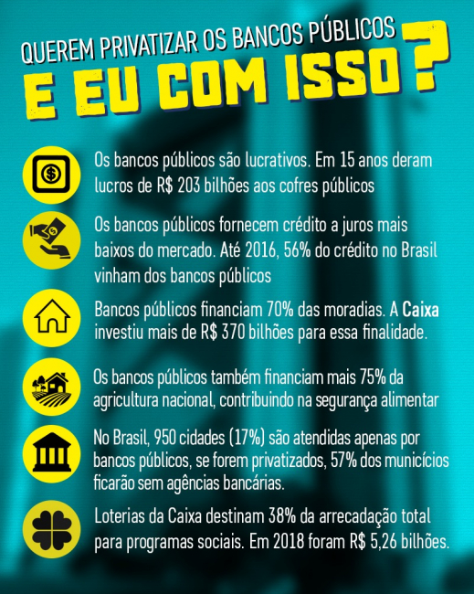 Segundo levantamento feito pela Contraf, até 2016, 56% do crédito no Brasil vinham dos bancos públicos. Somente o financiamento disponibilizado pelo BNDES cresceu 76,2% em termos reais de 2008 a 2016, chegando à casa dos R$ 601 bilhões. Desse total, R$ 522 bilhões foram destinados ao investimento de empresas na economia brasileira.