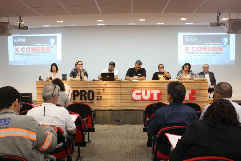 A abertura do X Congresso dos Urbanitários do DF – CONURB, realizada na manhã desta sexta-feira (22) foi marcada por discursos de solidariedade e compromisso com a luta em defesa do setor elétrico estatal e contra a retirada de direitos da classe trabalhadora.