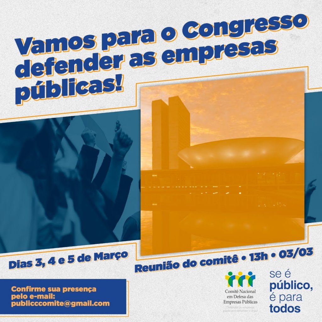 O Comitê Nacional em Defesa das Empresas Públicas convoca as entidades participante para atividade que acontecerá entre os dias 3 e 5 de março no Congresso Nacional, em Brasília. O objetivo é a discussão de leis e medidas provisórias relacionadas a projetos de privatização e visitas às lideranças partidárias e demais parlamentares para debater o tema. No dia 3, a partir das 13h, haverá uma reunião do comitê no próprio Congresso, em local a ser ainda definido e, posteriormente, terão início as conversações com os políticos, que se estenderão durante os três dias.