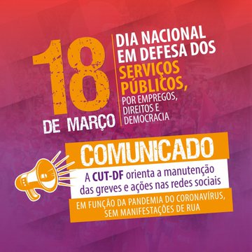 A CUT divulgou orientação para manutenção da greve, evitando aglomerações. Após avaliação da situação geral que ocorre especialmente no DF, SP e RJ, o Sindinorte deliberou por fazer um movimento diferente do que estamos acostumados a fazer – um movimento em massa, mas virtual.