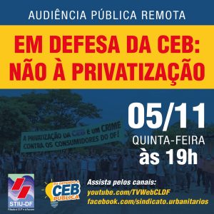 Na próxima quinta-feira, 5, a Câmara Legislativa do DF vai realizar uma audiência pública remota para discutir “o procedimento de desestatização da CEB Distribuição, pretendidos pela presidência da Companhia Energética de Brasília e pelo Governo do Distrito Federal”. A atividade foi requerida pelas deputadas Arlete Sampaio e Júlia Lucy (Novo), e pelos deputados Chico Vigilante (PT), Fábio Félix (PSol), Leandro Grass (Rede) e Rafael Prudente (MDB).
