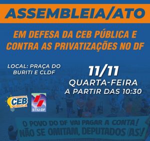 O STIU-DF convoca os trabalhadores e trabalhadoras da CEB para assembleia/ato amanhã, 11/11, 10h30, na praça da Câmara Legislativa. Na oportunidade, a entidade dará informes sobre todas as lutas contra a privatização da empresa. Haverá ônibus.