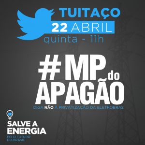 Para dar sequência às ações de enfrentamento à privatização da Eletrobras, na quinta-feira, 22, às 11h, será realizado um tuitaço contra a MP do Apagão. O objetivo é denunciar nas redes sociais o sucateamento da empresa e alertar a população sobre os impactos dessa medida.