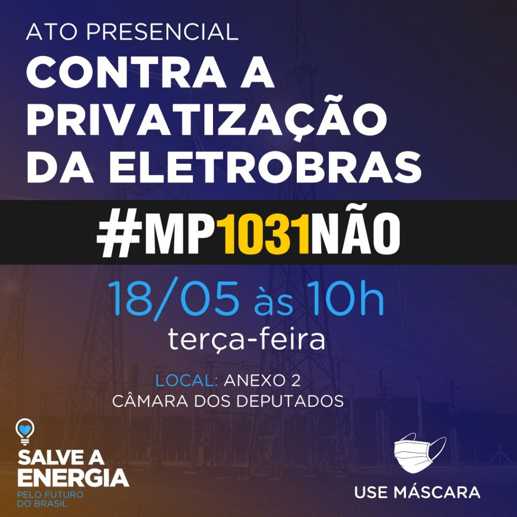Como parte das mobilizações em defesa da Eletrobras amanhã serão realizadas outras atividades. Estaremos no Twitter com a hashtag #MP1031Não, a partir das 11h, para denunciar a nefasta privatização da estatal e cobrar dos parlamentares o compromisso em defender a maior estatal elétrica da América Latina.