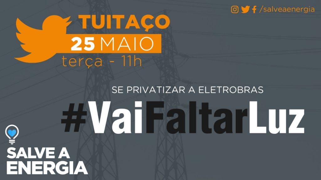 Amanhã (25), às 11h, tem tuitaço contra a privatização da Eletrobras. Nas redes sociais vamos usar a hashtag #VaiFaltarLuz. É hora de cobrar dos parlamentares o compromisso em defender a Eletrobras pública e alertar a população sobre os impactos desse projeto de destruição.