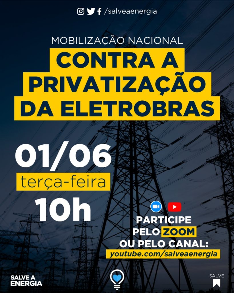 Convocada por parlamentares, com o apoio do Coletivo Nacional dos Eletricitários (CNE), nesta terça-feira, primeiro, às 10h, acontece nova plenária de mobilização contra a privatização da Eletrobras. A atividade tem como objetivo articular a luta política contra a Medida Provisória 1.031/21 no Senado Federal e impedir a destruição do patrimônio do povo brasileiro.