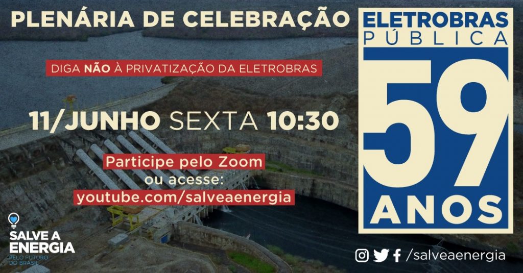 Entidades sindicais, movimentos populares e parlamentares realizam nesta sexta-feira (11), às 10h30, um grande ato de celebração aos 59 anos da Eletrobras Pública e contra a privatização da estatal. A atividade vai acontecer de modo presencial e virtual.