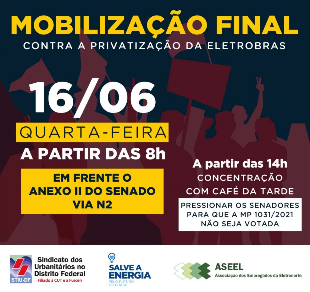 Hoje é o nosso dia D na luta em defesa da Eletrobras pública. Nesta quarta (16), a MP 1.031 está na pauta de votação do Senado e todos os trabalhadores e trabalhadoras precisam pressionar os senadores para que a MP do Apagão não seja aprovada.