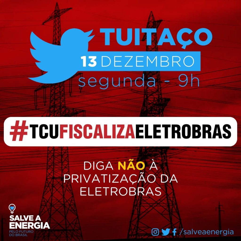Nesta segunda (13), às 9h, vamos cobrar nas redes a fiscalização efetiva do Tribunal de Contas da União (TCU) no processo irregular de privatização da Eletrobras. Para chamar a atenção da sociedade a todas as irregularidades no processo de tentativa de privatização faremos um tuitaço para subir a hashtag #TCUFiscalizaEletrobras.