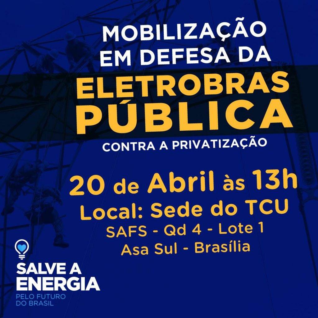 Companheiros e companheiras, chegou o momento de mostrar de que lado da história você quer ser lembrado. Do lado daqueles que lutaram pelo seu emprego e pela Eletrobras pública, ou do lado daqueles que se omitiram e facilitaram o processo de privatização da Eletrobras, não participando do ato público mais importante de nossas vidas: ato contra a privatização da Eletrobras, em frente ao TCU.