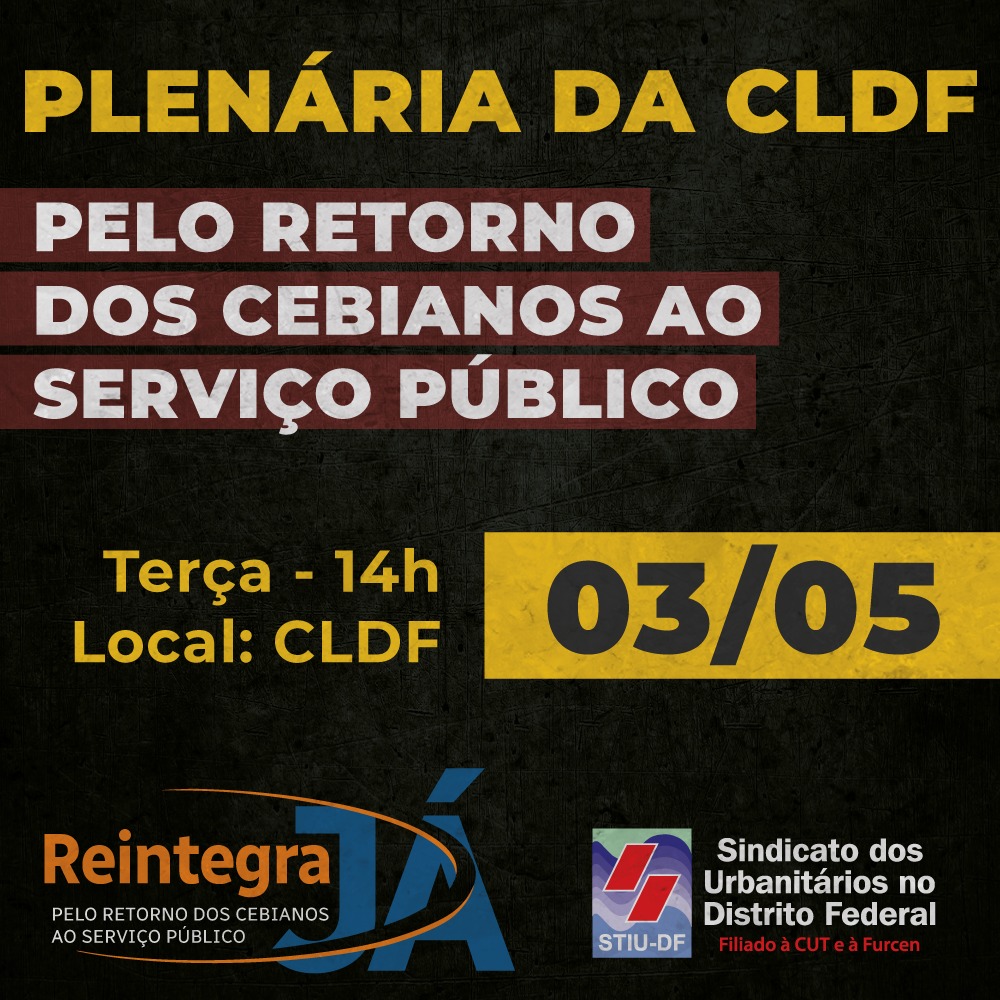 Na próxima terça-feira, dia 3, tem sessão plenária na Câmara Legislativa do Distrito Federal e para pressionar o governador Ibaneis Rocha (MDB) a dar celeridade ao envio de um projeto de lei de reintegração dos trabalhadores e trabalhadoras da extinta CEB Distribuição, o STIU-DF convoca toda a categoria da Neoenergia Brasília para participar da agenda e exigir o retorno dos profissionais ao serviço público.