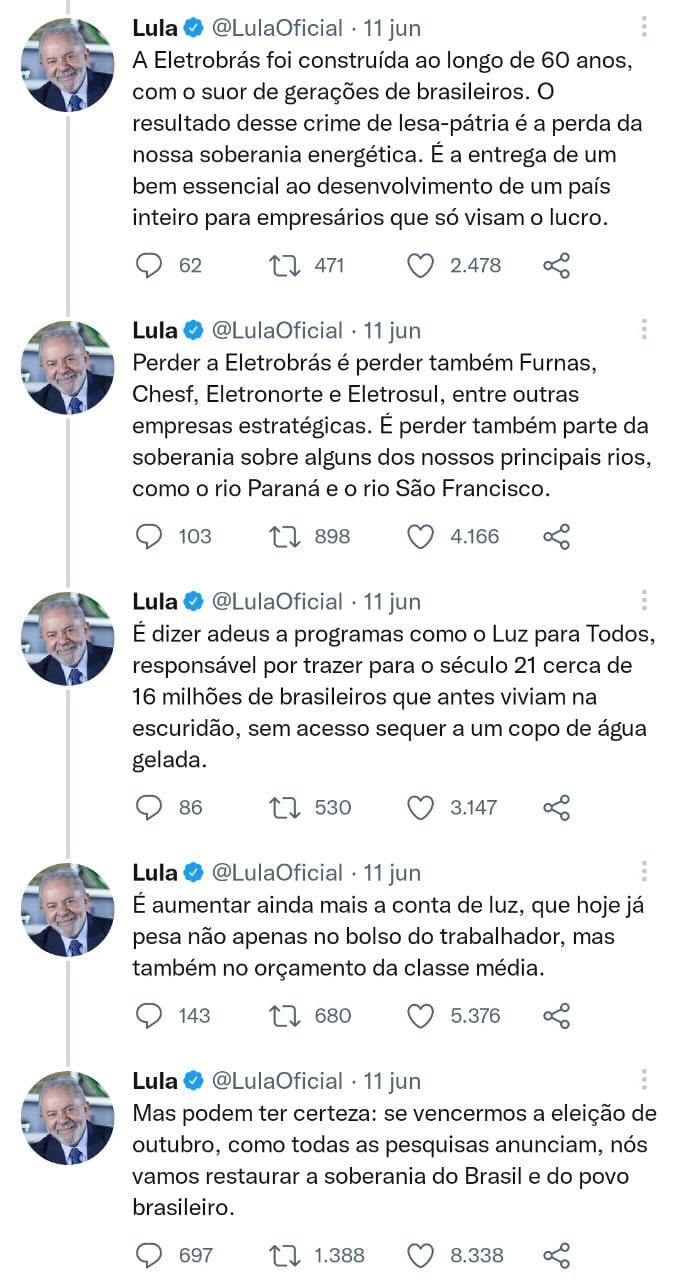 Essa é uma oportunidade única de mostrar a força de nossa campanha pela reestatização da Eletrobras para o país e para o Lula, apontado em todas as pesquisas eleitorais, como provável próximo presidente do Brasil, e em quem depositamos toda a nossa esperança pela reestatização da Eletrobras.