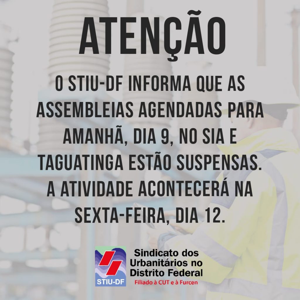 O STIU-DF informa aos trabalhadores e trabalhadoras da Neoenergia que as assembleias setoriais agendadas para esta terça-feira, 9, no SIA e Taguatinga estão suspensas. A atividade será realizada na sexta-feira, dia 12.
