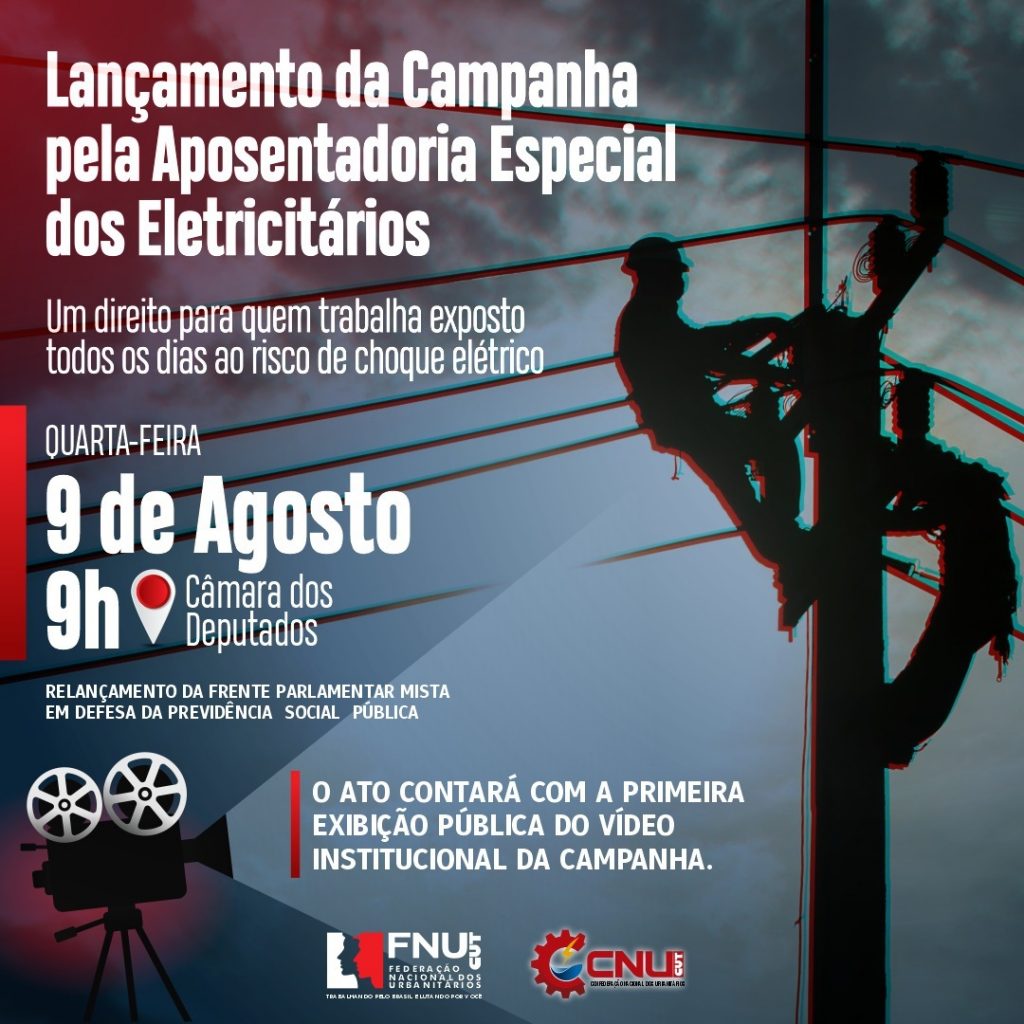 No próximo dia 9 de agosto, às 9 horas, junto ao relançamento da Frente Parlamentar Mista em Defesa da Previdência Social, na Câmara dos Deputados, os eletricitários lançam a Campanha em Defesa da Aposentadoria Especial dos Eletricitários, onde também será exibido um vídeo para sensibilizar parlamentares e sociedade sobre a importância do direito à aposentadoria especial a grande parte dos eletricitários que trabalham expostos ao agente perigoso eletricidade.