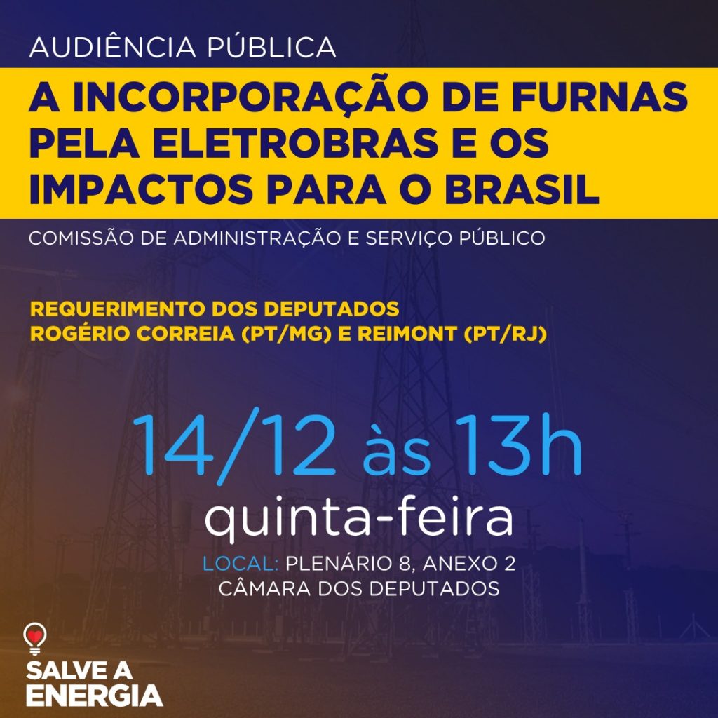 A Comissão de Administração e Serviço Público – CASP da Câmara dos Deputados realiza audiência pública, no dia 14 de dezembro, para debater a inciativa da Eletrobras de incorporar Furnas e seus efeitos para a prestação dos serviços de geração e transmissão de energia elétrica e suas consequências para Minas Gerais e o Brasil. A audiência atende o requerimento nº 85/2023 dos deputados Rogério Correia (PT/MG) e Reimont (PT/RJ).