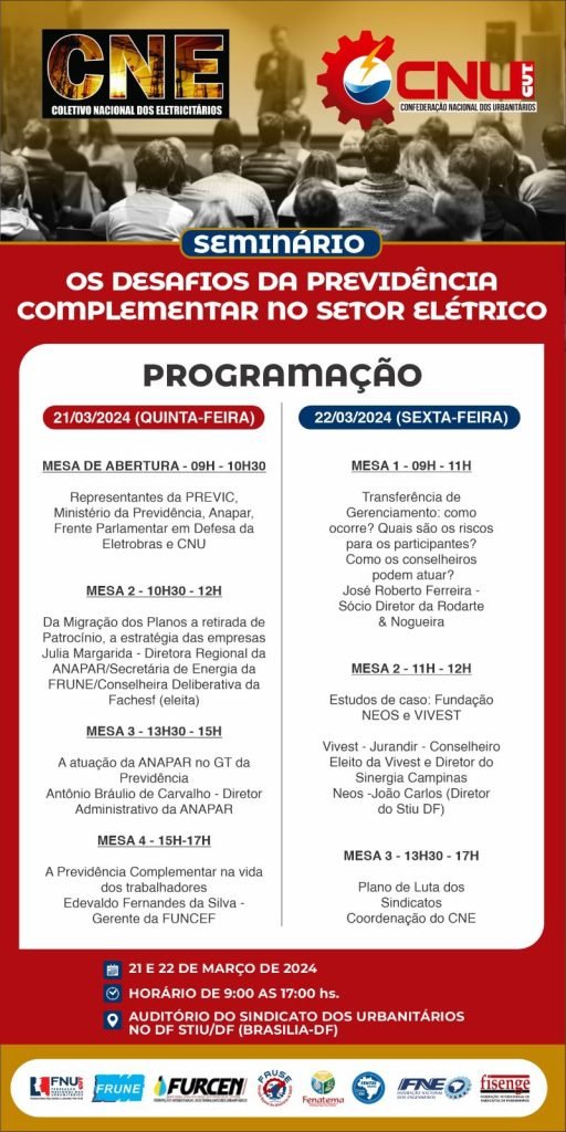 Nesta semana, o CNE e o STIU-DF continuarão suas mobilizações em Brasília. Nos dias 21 e 22, na sede do Sindicato dos Urbanitários, acontece o “Seminário: os desafios da previdência complementar no setor elétrico”, que discutirá as tendências e projeções para a previdência complementar na vida dos trabalhadores e trabalhadoras, além da definição de um plano de lutas. Além do seminário, os eletricitários têm agenda marcada no Ministério de Minas e Energia para tratar da renovação das concessões das distribuidoras.