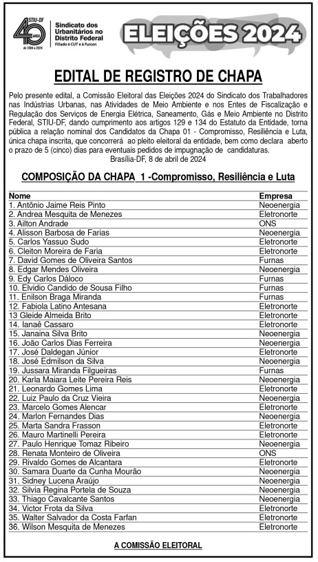 Conforme previsto no art. 129 do Estatuto do STIU-DF, a Comissão Eleitoral divulgou hoje, 09/04, o Edital de Registro de Chapa (ver abaixo), contendo os nomes dos componentes da CHAPA 01 – Compromisso, Resiliência e Luta, única inscrita para a eleição da nova Diretoria Colegiada e Conselho Fiscal da entidade, que ocorrerá nos dias 09 e 10 de maio próximo.