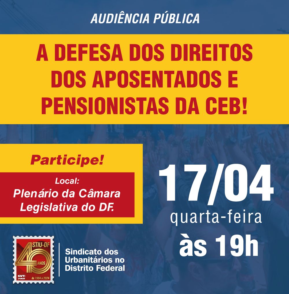 No próximo dia 17 de abril de 2024, às 19h, a Câmara Legislativa do DF realizará audiência pública, convocada pelo deputado Chico Vigilante (PT-DF), para debater e definir encaminhamentos sobre a luta dos aposentados e pensionistas da CEB pelo plano de saúde do GDF.