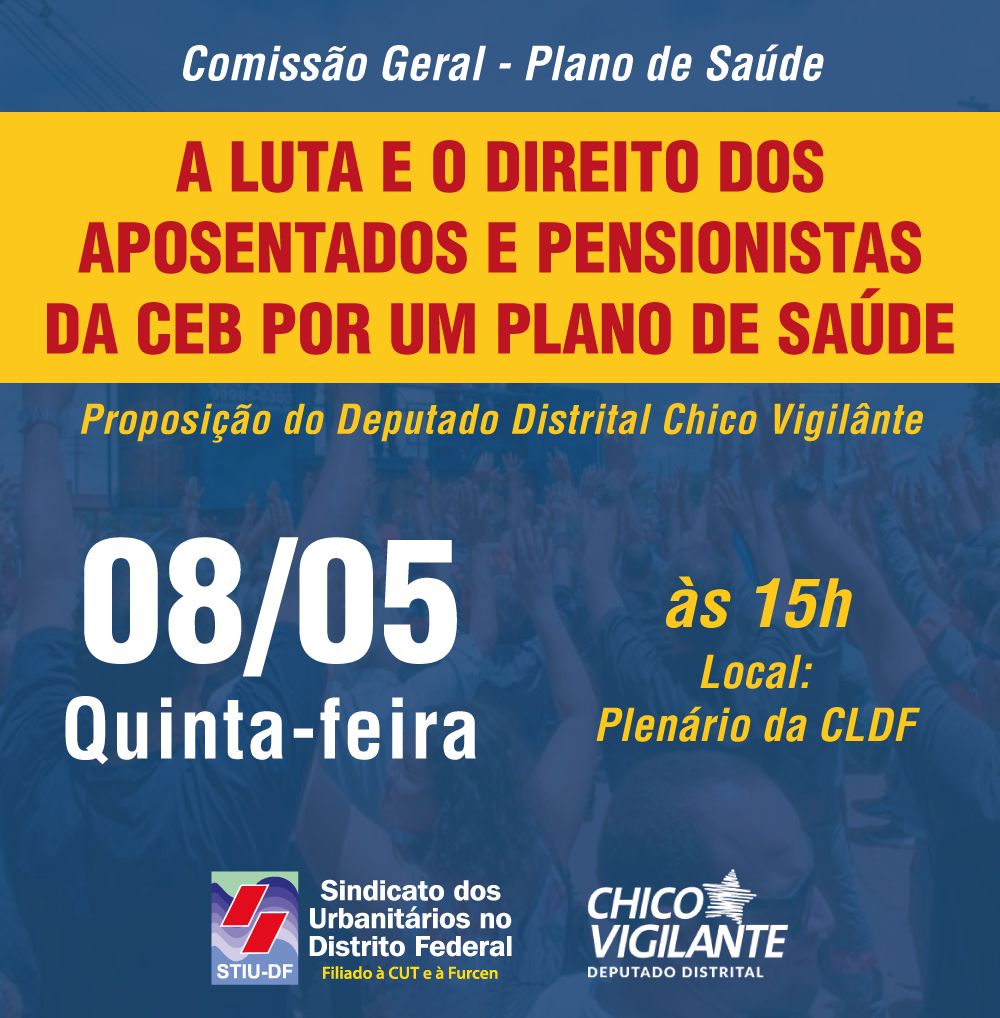 No próximo dia 08 de maio, às 15 horas, a Câmara Legislativa do Distrito Federal (CLDF) realizará uma Comissão Geral para debater a inclusão dos aposentados e pensionistas da CEB no plano de saúde administrado pelo Instituto de Assistência à Saúde dos Servidores do Distrito Federal (INAS-DF). A iniciativa, convocada pelo deputado Chico Vigilante, busca corrigir a situação dos assistidos, que estão, em sua maioria, sem assistência médica desde o fim do Plano de Saúde da FACEB, em agosto de 2023.