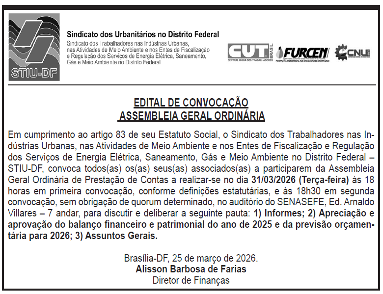 O Sindicato dos Urbanitários no Distrito Federal (STIU-DF) convoca todos os seus associados e associadas para participarem da Assembleia Geral Ordinária de Prestação de Contas, que será realizada no dia 31 de março de 2026 (terça-feira), às 18h em primeira convocação e às 18h30 em segunda convocação, conforme previsto no Estatuto da entidade.