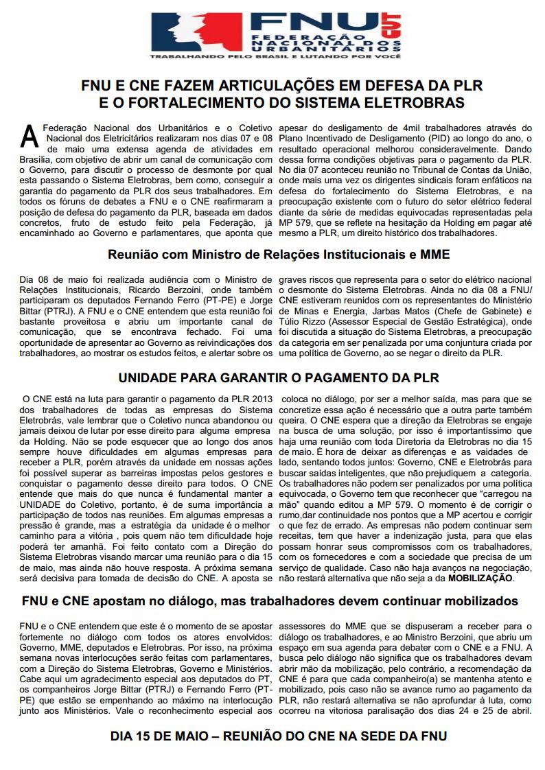 ELETRONORTE Eletronorte - Notícias Gerais FNU E CNE FAZEM ARTICULAÇÕES EM DEFESA DA PLR E O FORTALECIMENTO DO SISTEMA ELETROBRAS 12/05/2014 475 Compartilhar no Facebook Tweet tweet VISUALIZAR ARQUIVO EM PDF