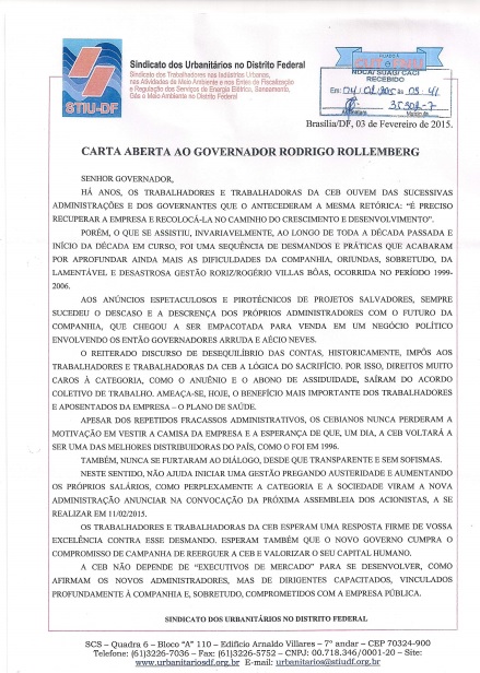 Na quarta-feira (4), o STIU-DF protocolou, no Palácio do Buriti, carta aberta ao governador Rodrigo Rollemberg. No documento, os dirigentes sindicais cobram o compromisso do Governo em reerguer a CEB e valorizar os trabalhadores e trabalhadoras da Companhia, que há anos sofrem com o descaso e a tentativa de retirada dos benefícios conquistados por meio da união e luta da categoria.