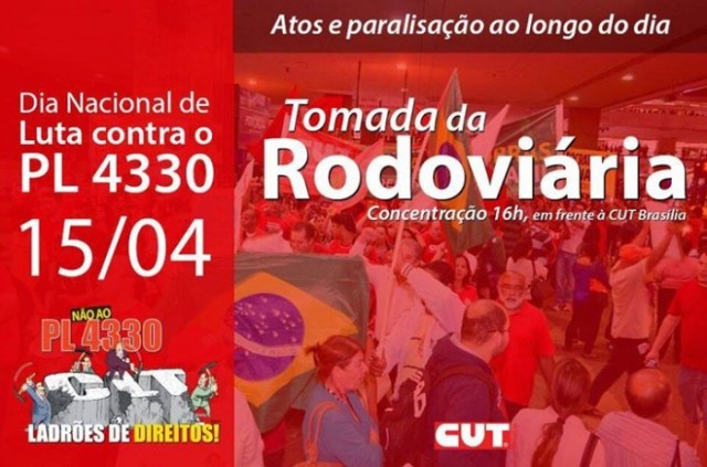 · Dia nacional de luta e paralisação em 15 de abril, quarta-feira, contra o PL 4330 e em defesa dos direitos dos trabalhadores, da democracia, da reforma política, da democratização dos meios de comunicação, da Petrobrás e contra a corrupção e o retrocesso. É um chamamento da CUT e dos principais movimentos sindicais e sociais.