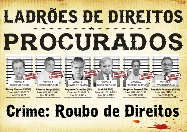 · Panfletagens diárias denunciando o roubo de direitos trabalhistas e os inimigos da classe trabalhadora, que são os 324 deputados bancados pelos empresários que aprovaram o texto-base PL 4330, que precariza o trabalho e legaliza a subcontratação generalizada (Clique aqui e veja o panfleto.);