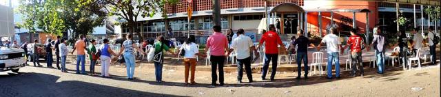 Homens e mulheres, do campo e da cidade, se reuniram no final da atividade para abraçarem simbolicamente a Celg, como demonstração da unidade na luta em defesa da classe trabalhadora, das empresas do setor elétrico, da luta pelo acesso à energia e pela soberania do Estado.