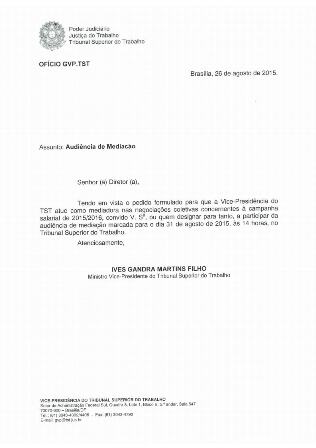 Fica claro que diante da falta de habilidade dos gestores da Holding em negociar, a empresa volta a se esconder atrás da justiça. Às 21h30 de ontem, a FNU recebeu convite do Tribunal Superior do Trabalho para comparecer às 14 horas, do dia 31 de agosto, para audiência de mediação.