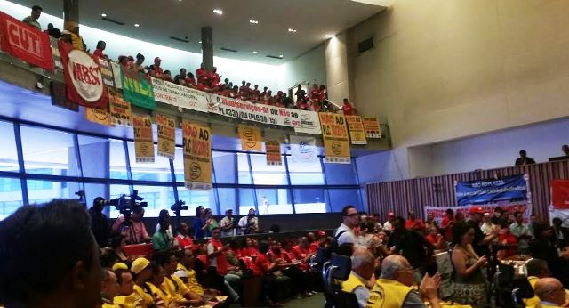 Centenas de trabalhadores e sindicalistas lotaram o plenário da Câmara Legislativa do Distrito Federal na sexta-feira (25) em audiência pública para discutir sobre o Projeto de Lei da Câmara que regulamenta a terceirização e precariza as relações de trabalho (PLC 30).