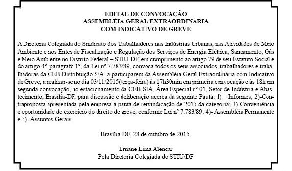 O STIU-DF convoca todos os trabalhadores e trabalhadoras da CEB para assembleia geral deliberativa, conforme edital publicado no Jornal de Brasília no dia 28/10/15, sobre a campanha salarial 2015, a ser realizada no dia 03/11/15 (terça-feira), às 17h30, em primeira convocação, e às 18h00, em última convocação, conforme edital de convocação abaixo.