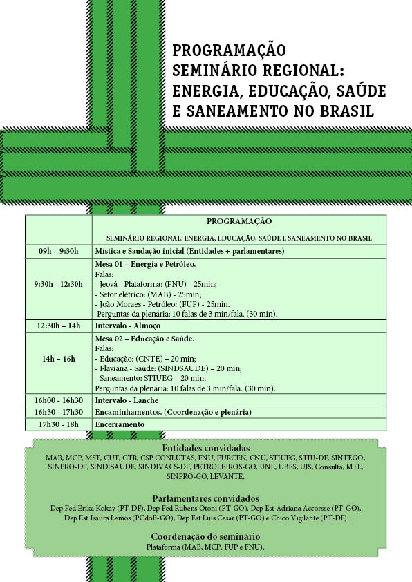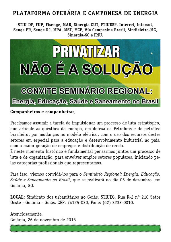 O STIU-DF, em parceria com a Plataforma Operária e Camponesa de Energia, promove o “Seminário regional energia, educação e saneamento no Brasil” onde serão debatidos temas fundamentais para a sociedade brasileira, bem como, a unidade de vários setores em defesa da energia e contra as privatizações. Sempre na perspectiva de uma sociedade mais justa, soberana e capaz de distribuir renda para todos os brasileiros e não para uma elite.