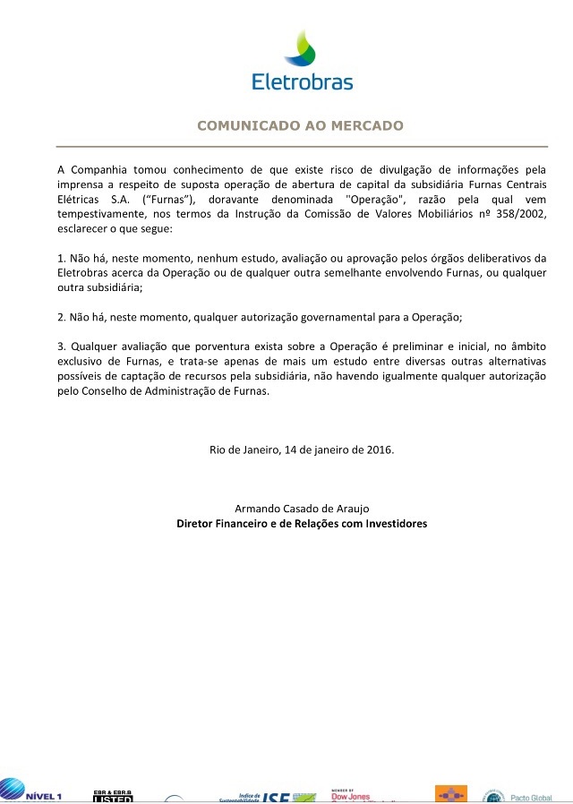 Em comunicado ao mercado, divulgado nesta quinta-feira (14), a Eletrobras nega qualquer operação para abertura do capital de Furnas. Esclarece ainda que, não há, no momento, qualquer autorização governamental para a operação.