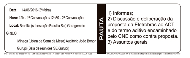 O STIU-DF convoca os trabalhadores e trabalhadoras de Furnas para importante assembleia geral deliberativa na próxima terça-feira (14), às 12h30, conforme a seguir: