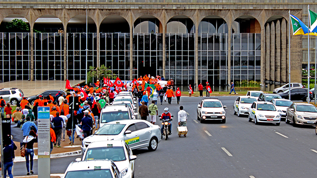 Trabalhadores e trabalhadoras do campo e da cidade participaram de protesto, na tarde de ontem (14), convocado pela Frente Parlamentar em Defesa da Petrobras, em frente ao Congresso Nacional. Os manifestantes protestavam contra o Projeto de Lei 4567/16, que visa tirar da Petrobras a função de operadora única do Pré-Sal. Além disso, acaba com a participação mínima de 30% que a empresa tem garantida nos processos licitatórios para exploração dessas reservas.