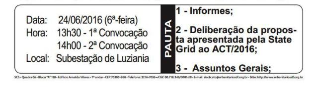 O STIU-DF convoca os trabalhadores e trabalhadoras da State Grid para importante assembleia geral deliberativa, conforme a seguir: