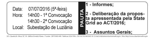 O STIU-DF convoca os trabalhadores e trabalhadoras da State Grid para importante assembleia geral deliberativa, conforme a seguir: